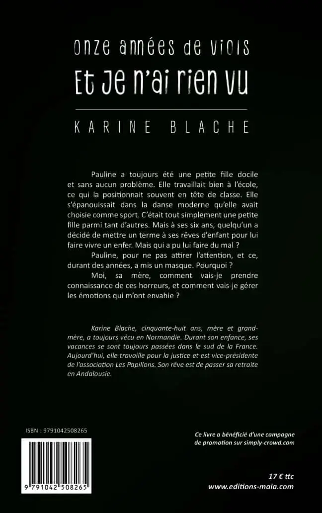 Karine Blache, cinquante-huit ans, mère et grand-mère, a toujours vécu en Normandie. Durant son enfance, ses vacances se sont toujours passées dans le sud de la France. Aujourd’hui, elle travaille pour la justice et est vice-présidente de l’association Les Papillons. Son rêve est de passer sa retraite en Andalousie.