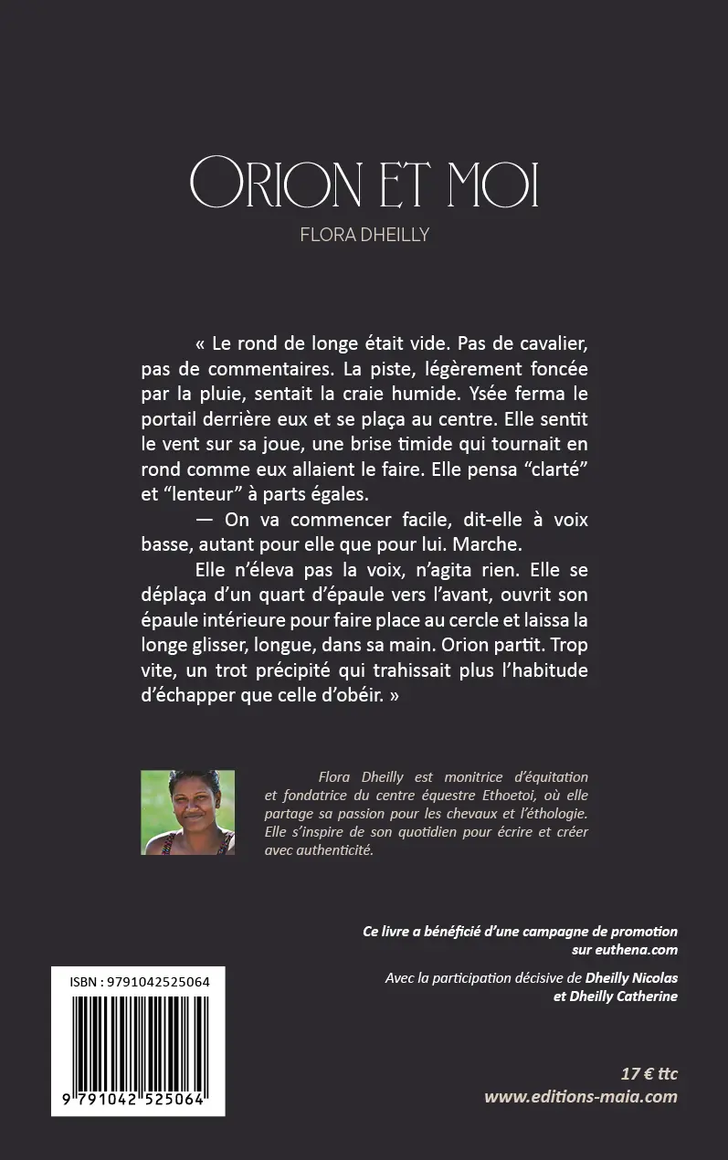 Flora Dheilly est monitrice d’équitation et fondatrice du centre équestre Ethoetoi, où elle partage sa passion pour les chevaux et l’éthologie. Elle s’inspire de son quotidien pour écrire et créer avec authenticité.