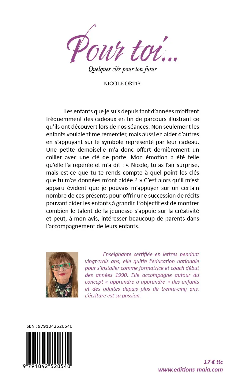 Les enfants que je suis depuis tant d’années m’offrent fréquemment des cadeaux en fin de parcours illustrant ce qu’ils ont découvert lors de nos séances. Non seulement les enfants voulaient me remercier, mais aussi en aider d’autres en s’appuyant sur le symbole représenté par leur cadeau. Une petite demoiselle m’a donc offert dernièrement un collier avec une clé de porte. Mon émotion a été telle qu’elle l’a repérée et m’a dit : « Nicole, tu as l’air surprise, mais est-ce que tu te rends compte à quel point les clés que tu m’as données m’ont aidée ? » C’est alors qu’il m’est apparu évident que je pouvais m’appuyer sur un certain nombre de ces présents pour offrir une succession de récits pouvant aider les enfants à grandir. L’objectif est de montrer combien le talent de la jeunesse s’appuie sur la créativité et peut, à mon avis, intéresser beaucoup de parents dans l’accompagnement de leurs enfants.