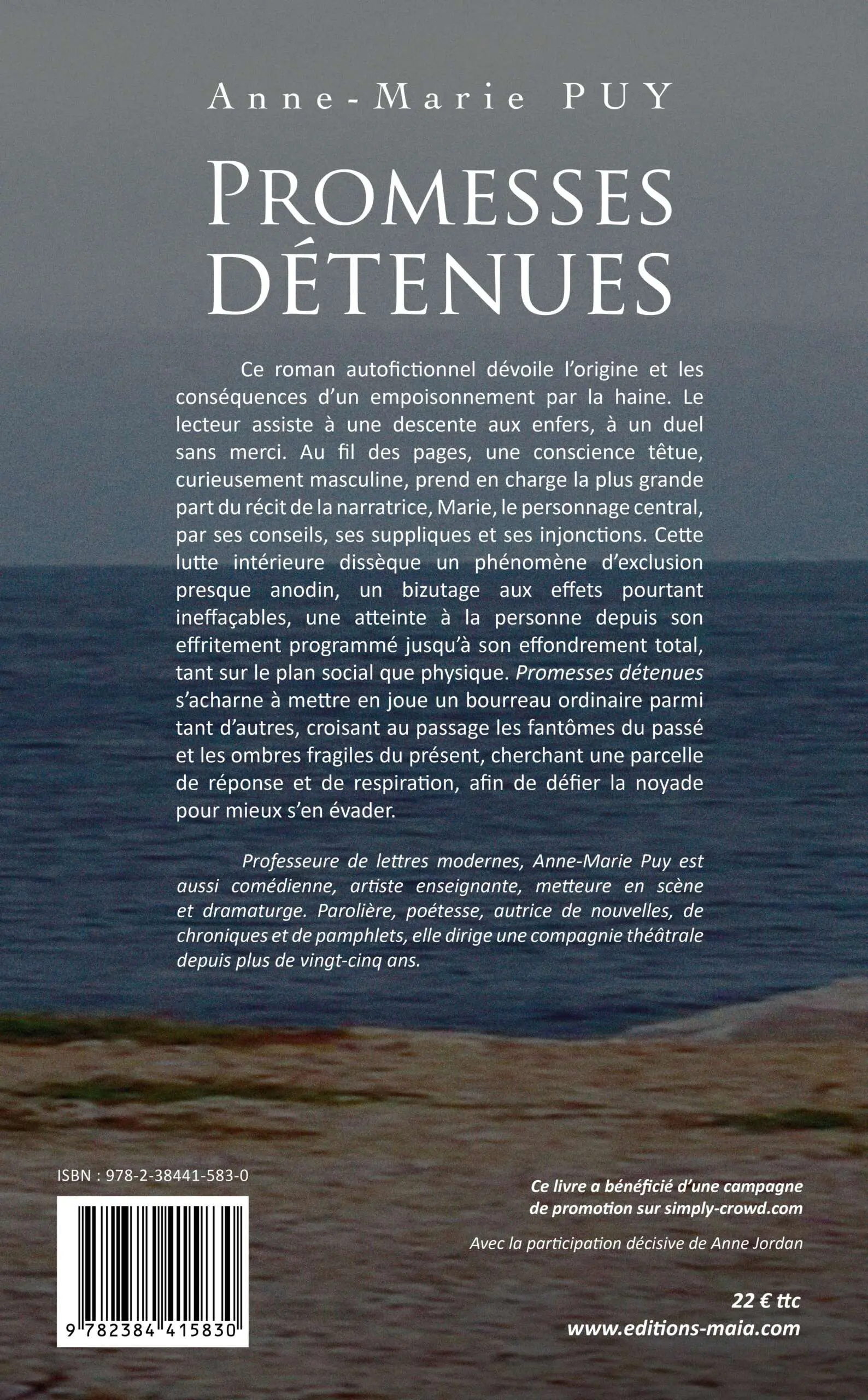 Ce roman autofictionnel dévoile l’origine et les conséquences d’un empoisonnement par la haine. Le lecteur assiste à une descente aux enfers, à un duel sans merci. Au fil des pages, une conscience têtue, curieusement masculine, prend en charge la plus grande part du récit de la narratrice, Marie, le personnage central, par ses conseils, ses suppliques et ses injonctions. Cette lutte intérieure dissèque un phénomène d’exclusion presque anodin, un bizutage aux effets pourtant ineffaçables, une atteinte à la personne depuis son effritement programmé jusqu’à son effondrement total, tant sur le plan social que physique. Promesses détenues s’acharne à mettre en joue un bourreau ordinaire parmi tant d’autres, croisant au passage les fantômes du passé et les ombres fragiles du présent, cherchant une parcelle de réponse et de respiration, afin de défier la noyade pour mieux s’en évader.