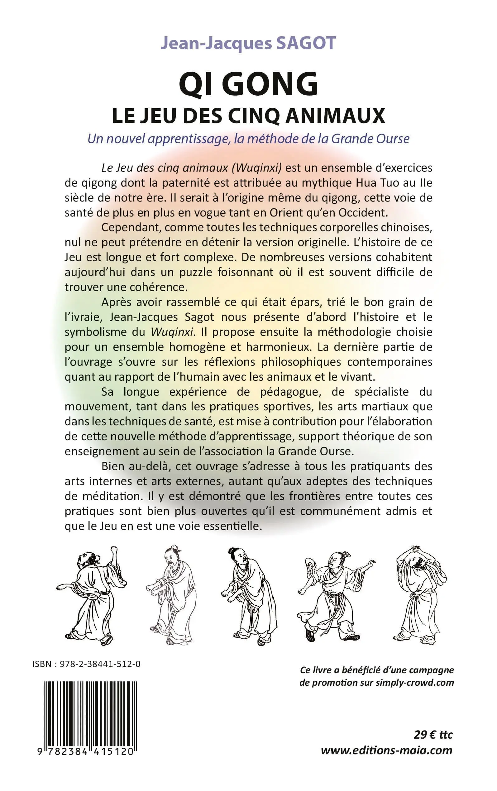 Après avoir rassemblé ce qui était épars, trié le bon grain de l’ivraie, Jean-Jacques Sagot nous présente d’abord l’histoire et le symbolisme du Wuqinxi. Il propose ensuite la méthodologie choisie pour un ensemble homogène et harmonieux. La dernière partie de l’ouvrage s’ouvre sur les réflexions philosophiques contemporaines quant au rapport de l’humain avec les animaux et le vivant.