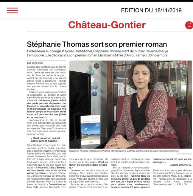 Stéphanie Thomas est née en 1969 aux Sables d’Olonne. Elle vit et enseigne en Mayenne. Reviens-moi je t’en supplie est son premier roman.