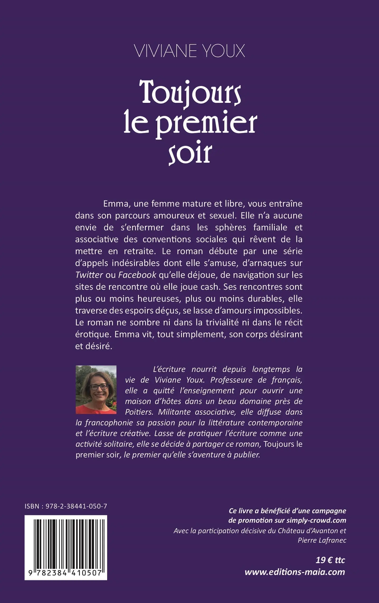 L’écriture nourrit depuis longtemps la vie de Viviane Youx. Professeure de français, elle a quitté l’enseignement pour ouvrir une maison d’hôtes dans un beau domaine près de Poitiers. Militante associative, elle diffuse dans la francophonie sa passion pour la littérature contemporaine et l’écriture créative. Lasse de pratiquer l’écriture comme une activité solitaire, elle se décide à partager ce roman, Toujours le premier soir, le premier qu’elle s’aventure à publier.
