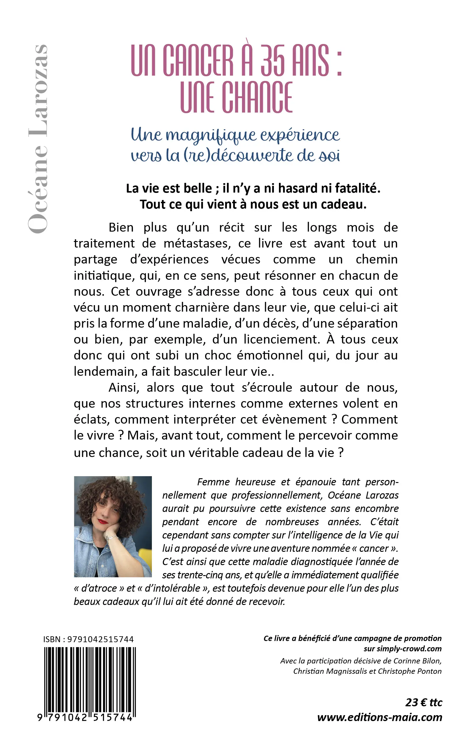 Femme heureuse et épanouie tant personnellement que professionnellement, Océane Larozas aurait pu poursuivre cette existence sans encombre pendant encore de nombreuses années. C’était cependant sans compter sur l’intelligence de la Vie qui lui a proposé de vivre une aventure nommée « cancer ». C’est ainsi que cette maladie diagnostiquée l’année de ses trente-cinq ans, et qu’elle a immédiatement qualifiée « d’atroce » et « d’intolérable », est toutefois devenue pour elle l’un des plus beaux cadeaux qu’il lui ait été donné de recevoir.