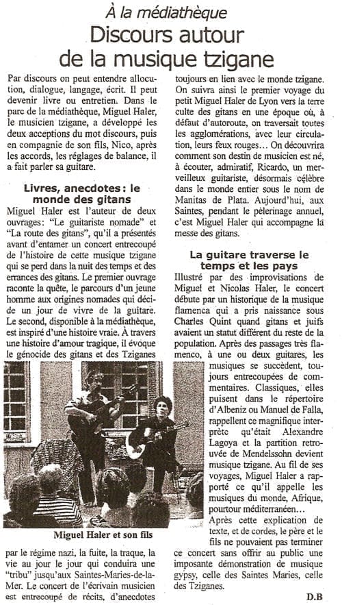 Miguel Haler est né dans les années cinquante, à la croisée de deux cultures, l’une nomade par son grand-père maternel, l’autre sédentaire par son père. Il est grand-père de deux petites-filles et parcourt la France avec sa guitare. Il se produit également chaque année aux Saintes-Marie-de-la-Mer lors du pèlerinage annuel des gitans.