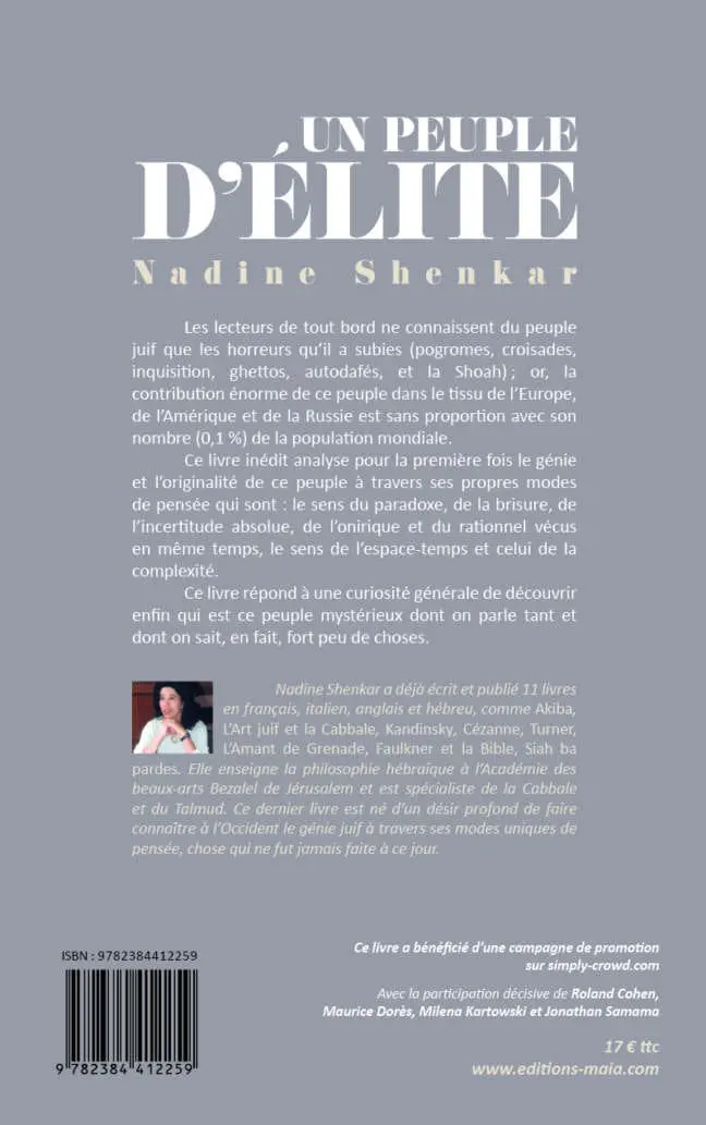Nadine Shenkar a déjà écrit et publié 11 livres en français, italien, anglais et hébreu, comme Akiba, L’Art juif et la Cabbale, Kandinsky, Cézanne, Turner, L’Amant de Grenade, Faulkner et la Bible, Siah ba pardes. Elle enseigne la philosophie hébraïque à l’Académie des beaux-arts Bezalel de Jérusalem et est spécialiste de la Cabbale et du Talmud. Ce dernier livre est né d’un désir profond de faire connaître à l’Occident le génie juif à travers ses modes uniques de pensée, chose qui ne fut jamais faite à ce jour.