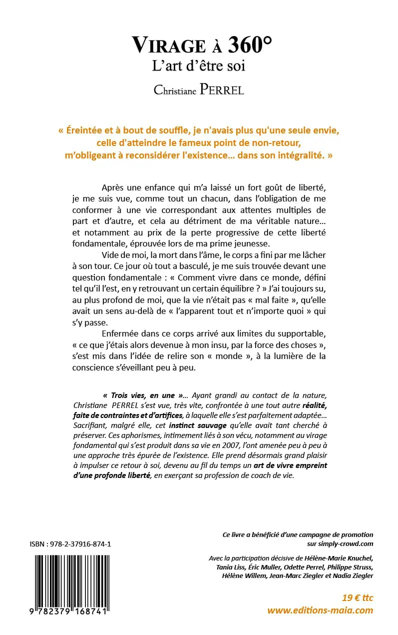« Trois vies, en une »… Ayant grandi au contact de la nature, Christiane Perrel s’est vue, très vite, confrontée à une tout autre réalité, faite de contraintes et d’artifices, à laquelle elle s’est parfaitement adaptée… Sacrifiant, malgré elle, cet instinct sauvage qu’elle avait tant cherché à préserver. Ces aphorismes, intimement liés à son vécu, notamment au virage fondamental qui s’est produit dans sa vie en 2007, l’ont amenée peu à peu à une approche très épurée de l’existence. Elle prend désormais grand plaisir à impulser ce retour à soi, devenu au fil du temps un art de vivre empreint d’une profonde liberté, en exerçant sa profession de coach de vie.