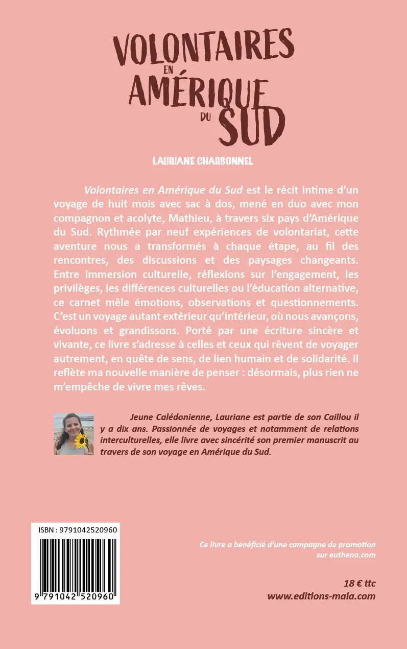 Volontaires en Amérique du Sud est le récit intime d’un voyage de huit mois avec sac à dos, mené en duo avec mon compagnon et acolyte, Mathieu, à travers six pays d’Amérique du Sud. Rythmée par neuf expériences de volontariat, cette aventure nous a transformés à chaque étape, au fil des rencontres, des discussions et des paysages changeants. Entre immersion culturelle, réflexions sur l’engagement, les privilèges, les différences culturelles ou l’éducation alternative, ce carnet mêle émotions, observations et questionnements. C’est un voyage autant extérieur qu’intérieur, où nous avançons, évoluons et grandissons. Porté par une écriture sincère et vivante, ce livre s’adresse à celles et ceux qui rêvent de voyager autrement, en quête de sens, de lien humain et de solidarité. Il reflète ma nouvelle manière de penser : désormais, plus rien ne m’empêche de vivre mes rêves.